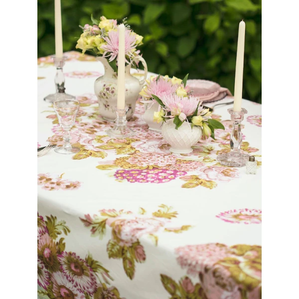 April Cornell's Spring tablecloths are just wonderful!  Brightening a room alongside blooming flowers feels so good and is guaranteed to enliven the mood. Gorgeous signature pattern crafted from fresh mint, violet, french pink and soft sage.