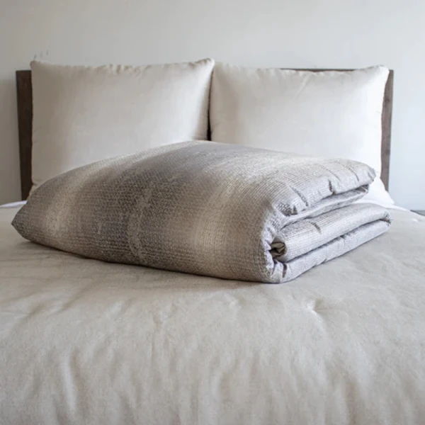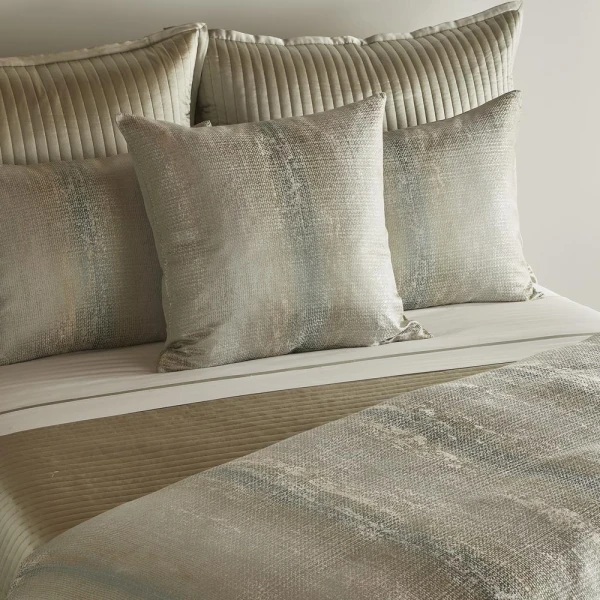 Ann Gish's Anguilla Decorative Accessories are shimmery, soft and is available in three color ways. It gets its name from the Caribbean island. This is a subtle ombre jacquard studded with pockets of silver that resemble the sand at the bottom of a lagoon. Pillows have a knife edge finish and includes feather/down insert and zips closed. This throw is padded and reverses to solid-color Duchess satin.