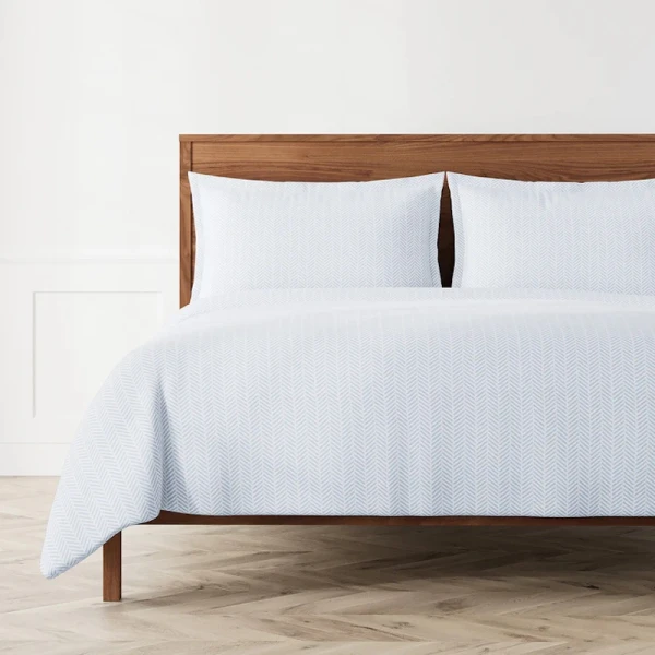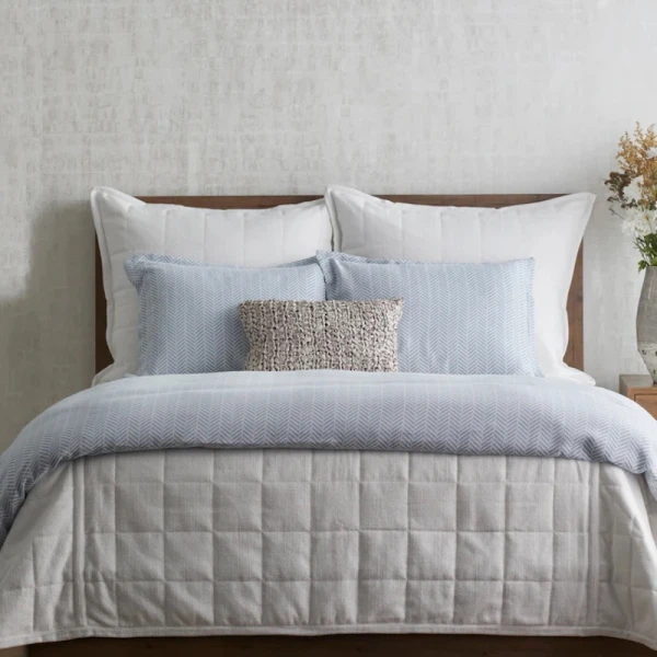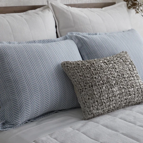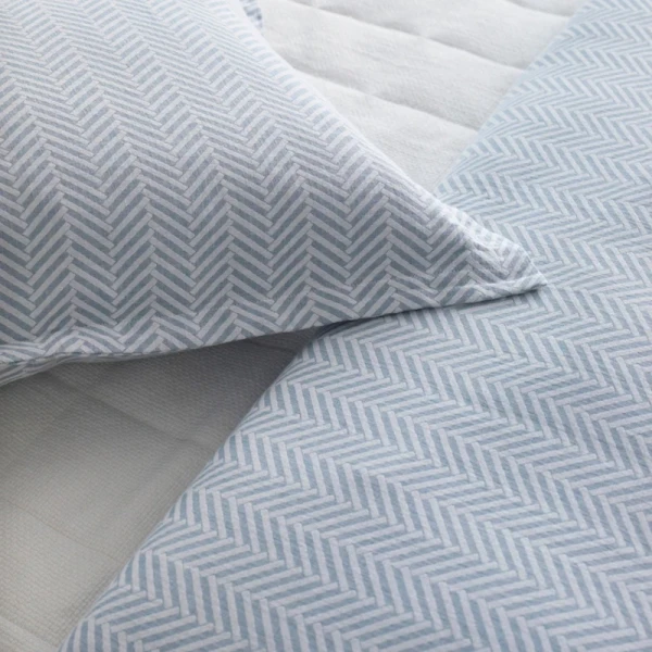 Ann Gish's Aran duvet set features a blue and white herringbone weave. Aran is name after the Irish knit. Knife edge finish. Reverses to white percale cotton. Button Closure. 100% cotton Oeko-tex certified. Machine washable.