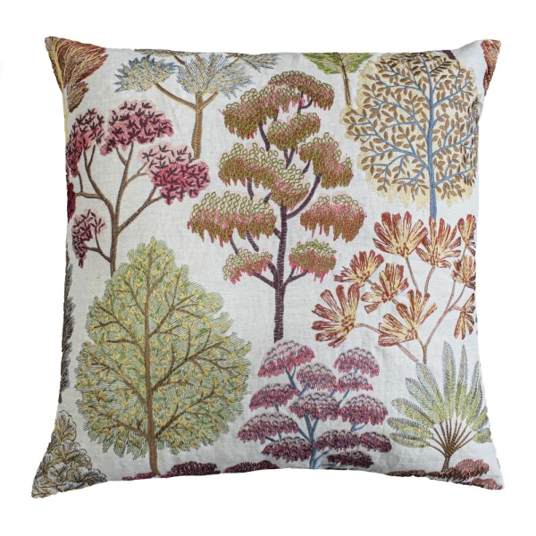 Ann Gish's Arcadia was inspired by an Autumnal forest, Arcadia pillow features a colorful botanical pattern embroidered onto a natural linen ground. The intriguing pattern and subtle texture will add warmth and depth to any space. Arcadia throw reverses to smooth matching linen. Tacked with graham ties.  100% linen with embroidery.