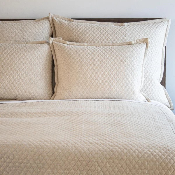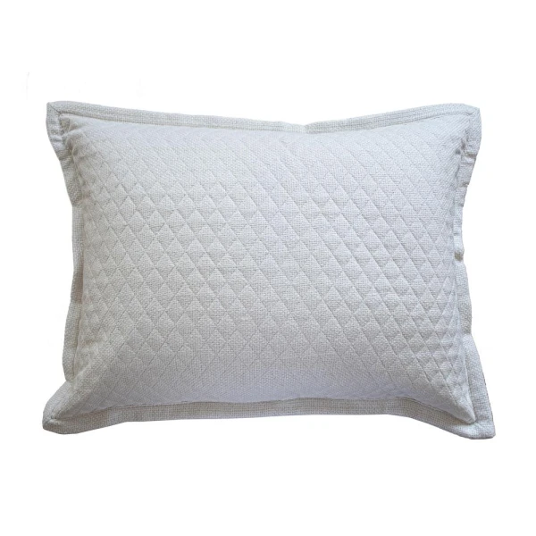 Ann Gish's Silk Basketweave Quilted Collection is a classic 1 inch diamond quilted coverlet that has plain silk bands at joining seams as well as 1 inch wide banding around the edge. The collection is lined with cotton sateen.  The Quilted Basketweave collection is available in quilted coverlets, shams, & box spring covers. It is available in natural and in ivory. 100% silk. 100% cotton lining.