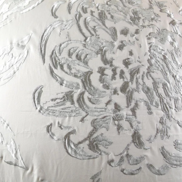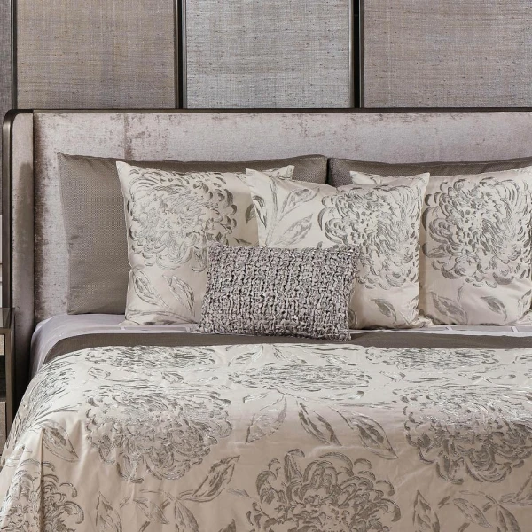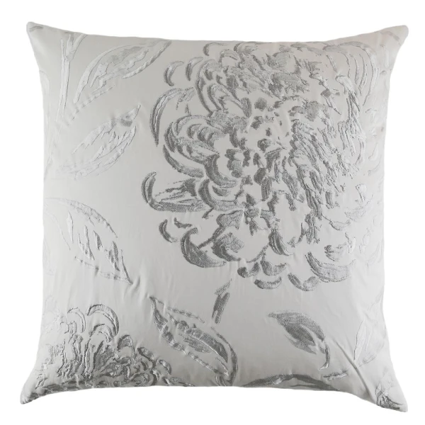 Ann Gish's Glory Collection is has a silver on silver embroidery that outlines elegant oversized chrysanthemums.  Soft ivory cotton twill ground sets off the motif for a more dramatic effect. Duvet cover reverses to a fine cotton lining.  The foot quilt reverses to a cotton satin and is lightly padded.  Feather & down fill included for the decorative pillow.  Pillow has a zipper closure.