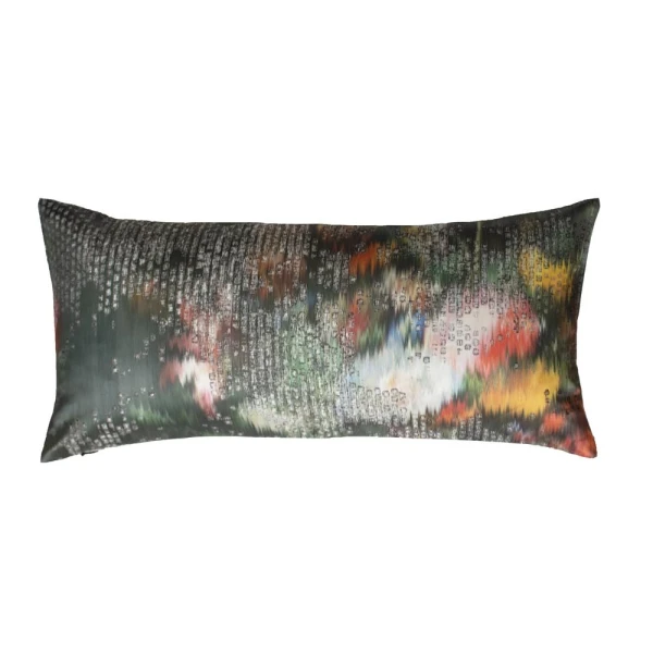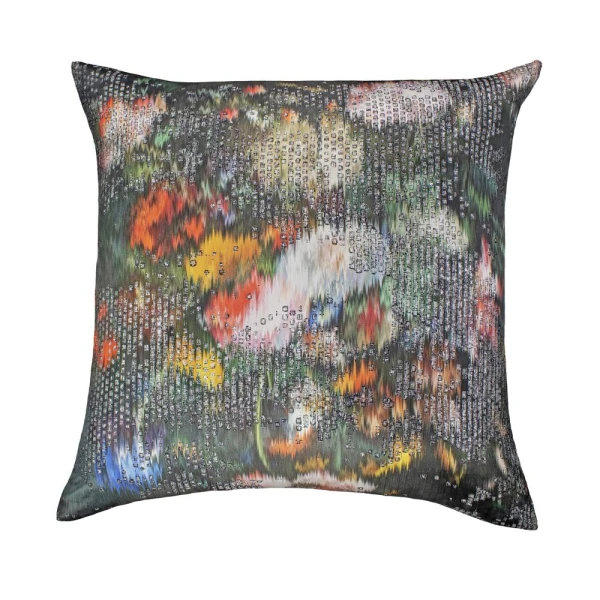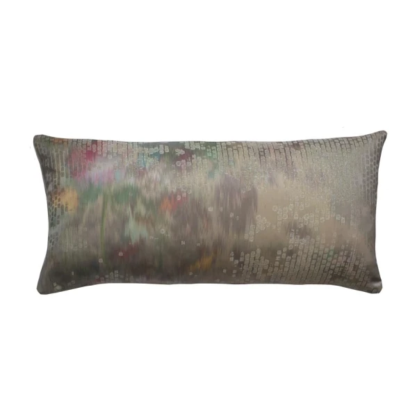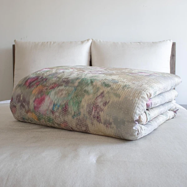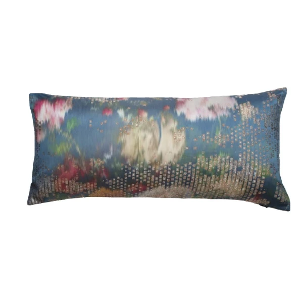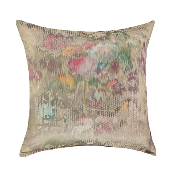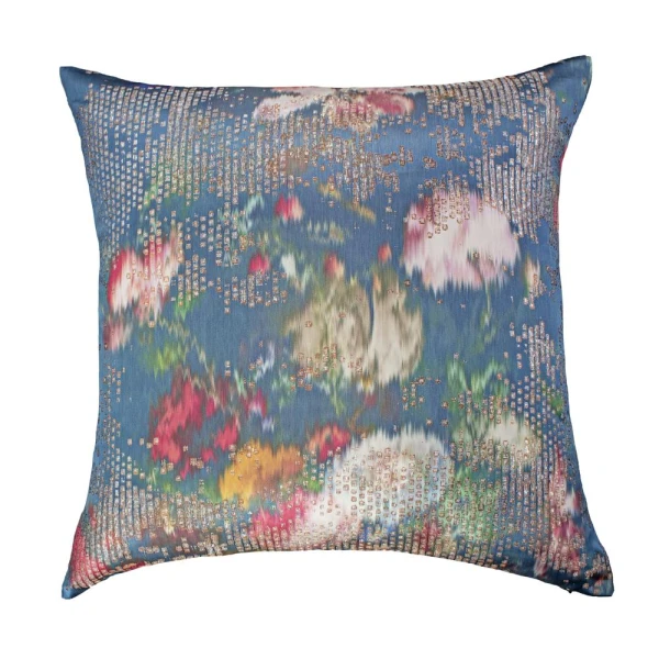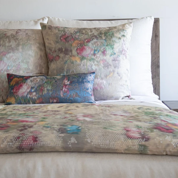 Ann Gish's Ibiza decorative pillows and foot quilt are a mix of a gorgeous soft watercolor jacquard with an effect called 'eye-glitter.'  Pillows have a zipper closure and include a feather/down fill. Named for the Mediterranean island, Ibiza mixes a soft watercolor floral with over-woven silver scales, taking a traditional pattern into high-design. Throw is padded.  55% polyester and 45% viscose.
