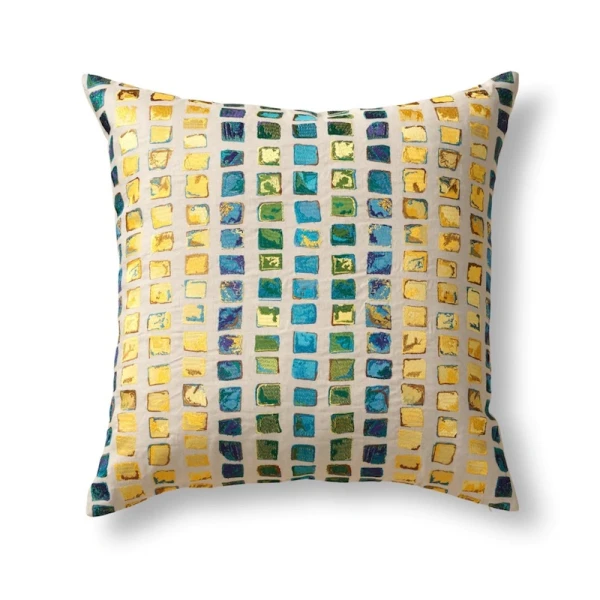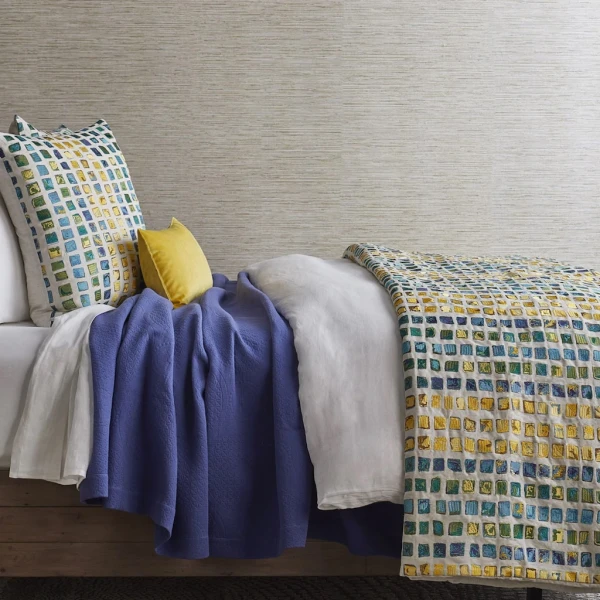 Ann Gish's Tesserae Accessories are part of The Met x Ann Gish collection.  It was inspired by a medieval mosaic Tesserae, this fabric features the shades of the color wheel.  Pillow reverses to solid linen/cotton.  Zip closure with feather/down fill.  60% linen 40% cotton.  Foot Quilt reverses to solid linen/cotton. Lightly padded with poly fiberfill.  60% linen 40% cotton.