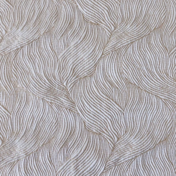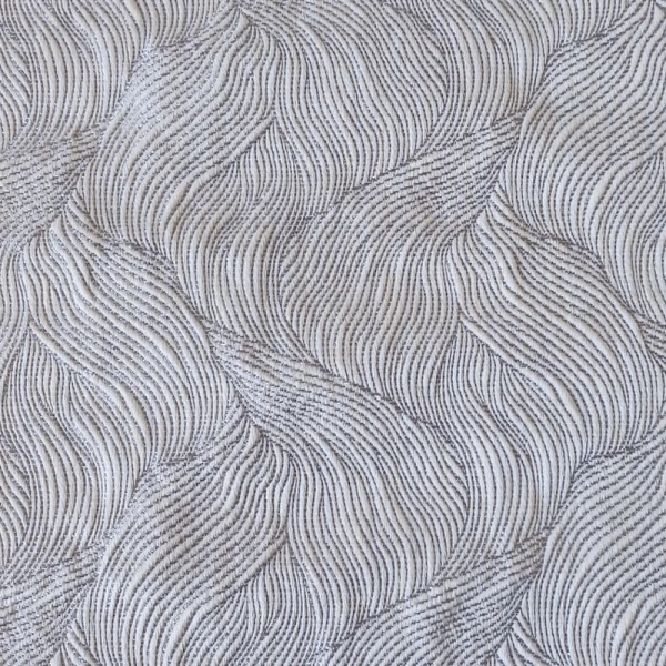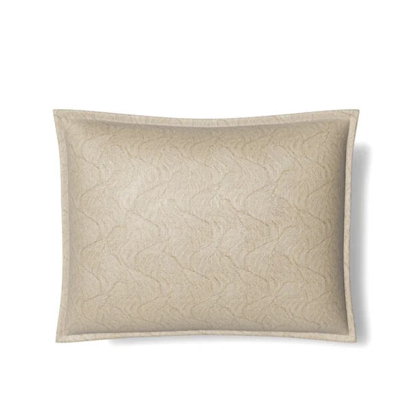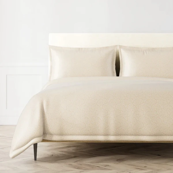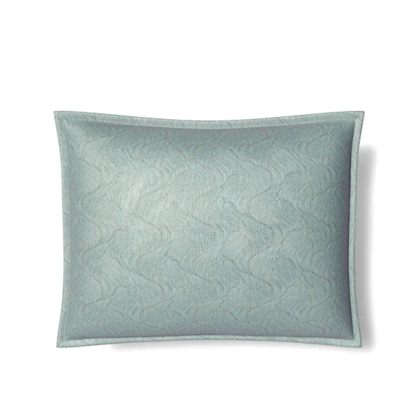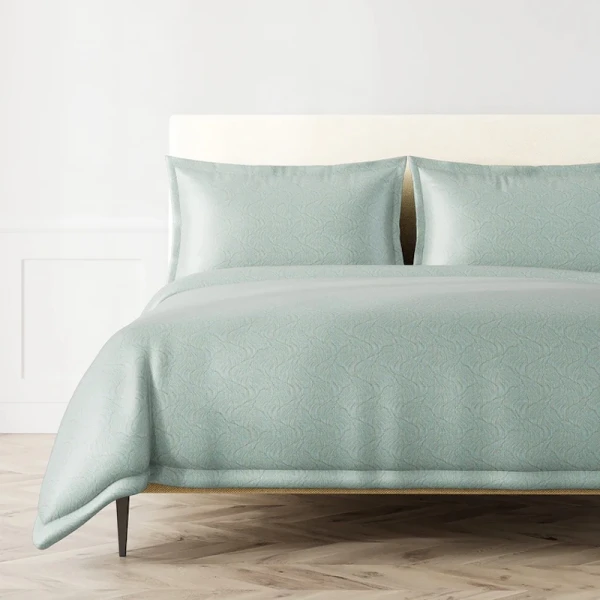 Ann Gish's Tidal duvet set features a wavy jacquard design that mixes soft neutrals with a touch of sparkle. It was inspired by the magnetism of metals. Topstitched flange. Reverses to off-white peach skin polyester. Zipper closure and corner ties. Machine washable. 100% polyester. Available in Aqua, Gold, and Silver.
