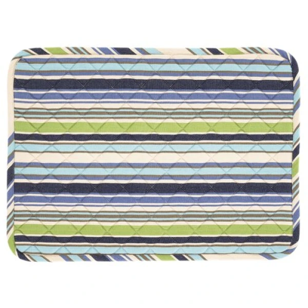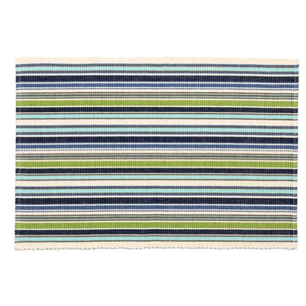 Annie Selke's Pond Stripe Napkins and Placemats are inspired by Annie Selke's best selling Pond flat woven cotton rug.  The napkins are oversized and colorful they can also be used as tea towels. Variegated stripes in Grassy Green, Aqua, and Sky intersperse with variegated Indigo and White deck stripes.  Sold in sets of 4. 100% Cotton. 1" hem on all 4 sides and 1/4" hem on length end of placemats. Now available in quilted placemats.