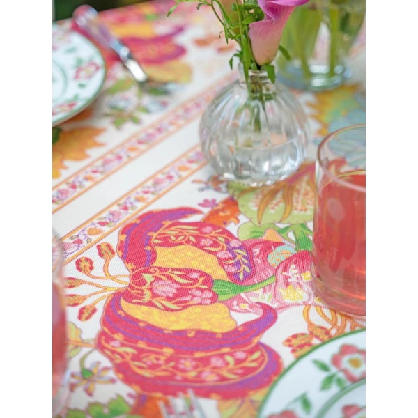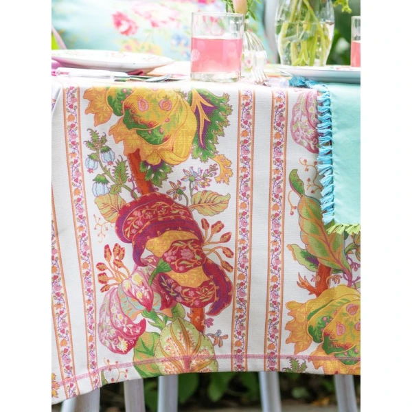 April Cornell's Blooming Jungle Outdoor Tablecloth is lovely and perfect for dining Al Fresco! April's signature designs are finally available for the great outdoors! These styles are crafted from durable outdoor material made from partially recycled plastic bottles. Your space will be beautiful and each piece is helping to keep the environment beautiful too! Signature April Cornell Print 100% Polyester