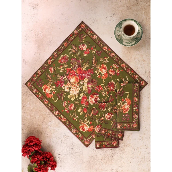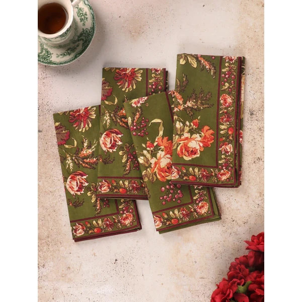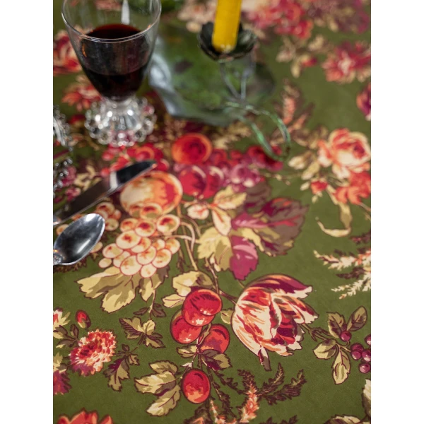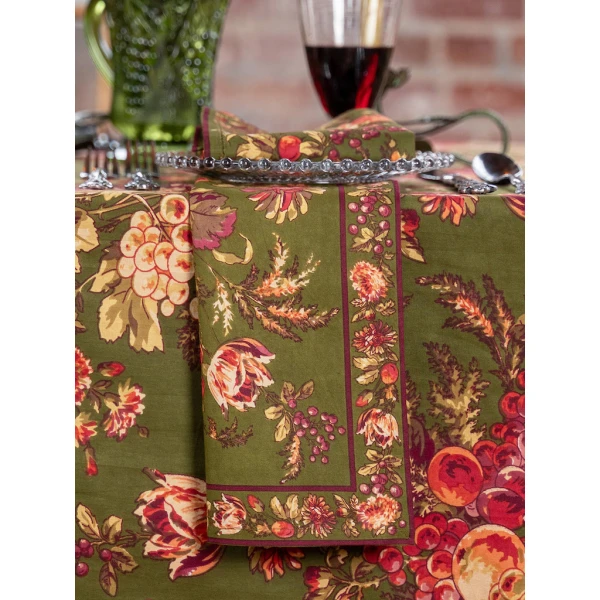 April Cornell's Bountiful Harvest in Olive Napkins are spectacular. They were inspired by some serious 'Home Love', and it invokes the abundance of the season with this exquisitely articulated, soulfully hued cotton creation celebrating the fruits of the season. Magnificent. Brand new "Signature April Cornell Print" this season. 100% cotton.