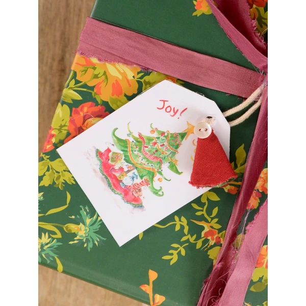 April Cornell's Christmas Art Gift tags are made of paper, fabric and a mother of pearl button accent.  Wrap the perfect gift using April's tags.