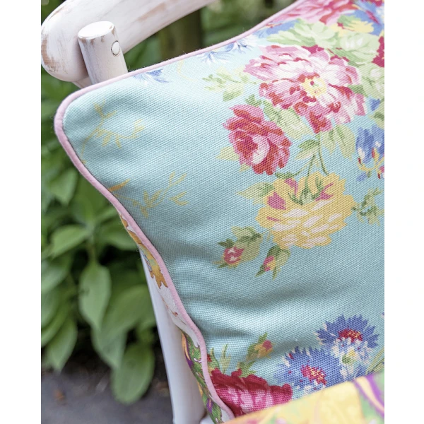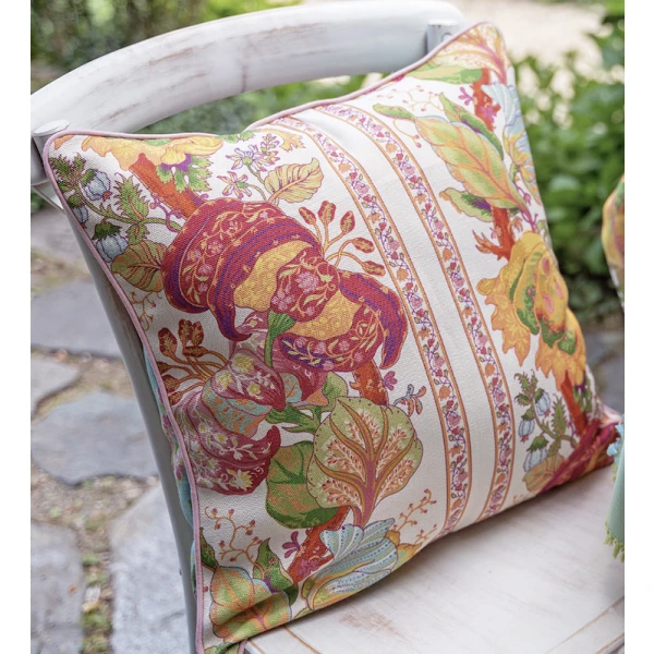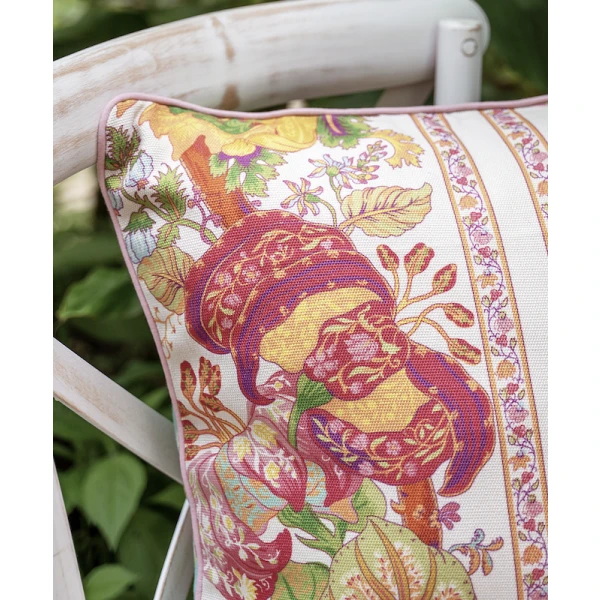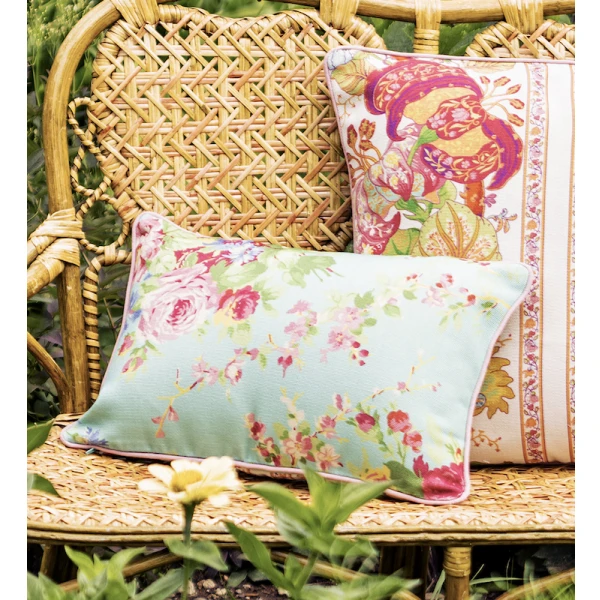 April Cornell's Cottage Rose Outdoor Cushion Cover is comprised of hand crafted flowers, uplifting signature color and a deep commitment to quality and craft.  The outdoor cushions reverse to Blooming Jungle fabric.  They are corded in pink.  Zipper Closure. Signature April Cornell Print. 100% Polyester.