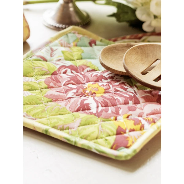 April Cornell's Lawn Party Patchwork Potholder Set is a necessary complement for every kitchen, these original pot holders add just the right colorful spice to enliven a happy home!  Transform the everyday in a special way! Pretty printed potholders for the woman who (almost!) has it all. The potholders come in a set of two. 100% cotton.