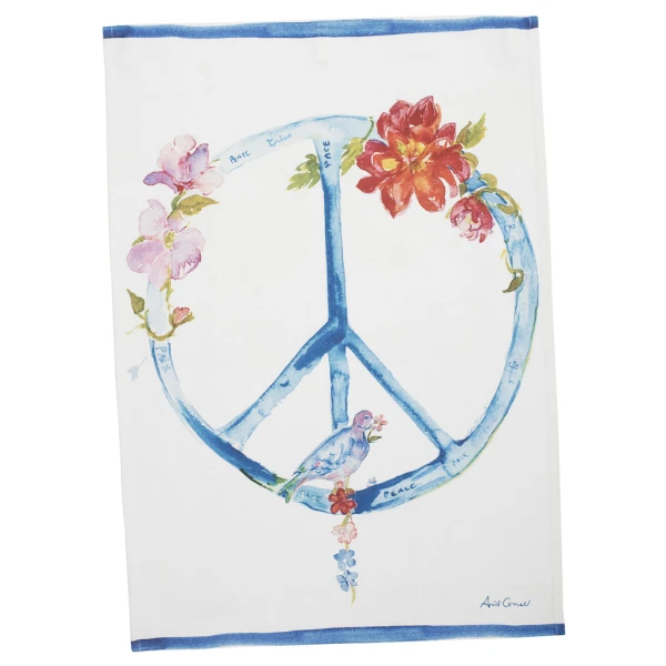 April Cornell's peace Tea Towel is made of uniquely charming textiles that deliver a delightful splash of color and texture to the heart of your kitchen. Art is rarely (if ever) this practical, and our curated cotton weaves are tailor made for soaking up all of life's little messes! April's Artwork.  100% Cotton.