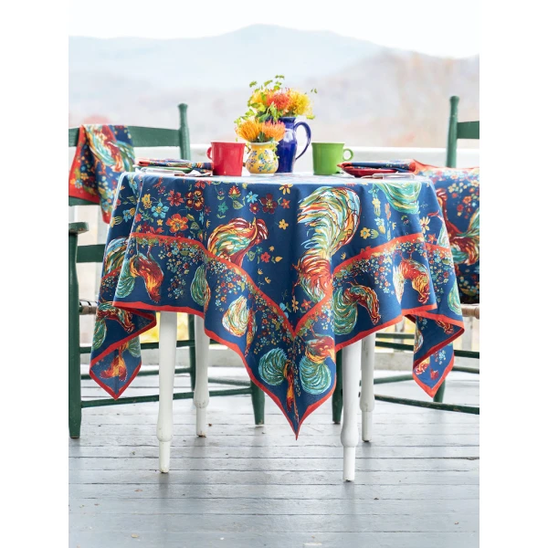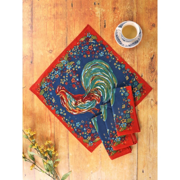 April Cornell's Rooster in Navy table linens are so cheerful. Once more her iconic Rooster appears, eager to serenade your home with a dose of feel-happy color! Cock-A-Doodle-D 100% cotton.