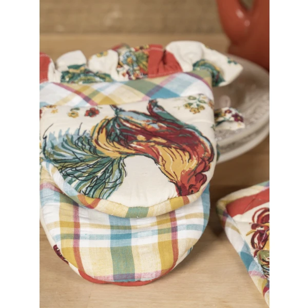 April Cornell's Rooster Patchwork Mini Mitt Set is in a Signature April Cornell Print.   A necessary complement for every kitchen, these original oven mitts add just the right colorful touch to enliven a happy home!  This pattern spring to life in beautiful quilted designs and are lined with raw cotton for functional heat absorption. The mitts come in a set of two.  100% cotton.