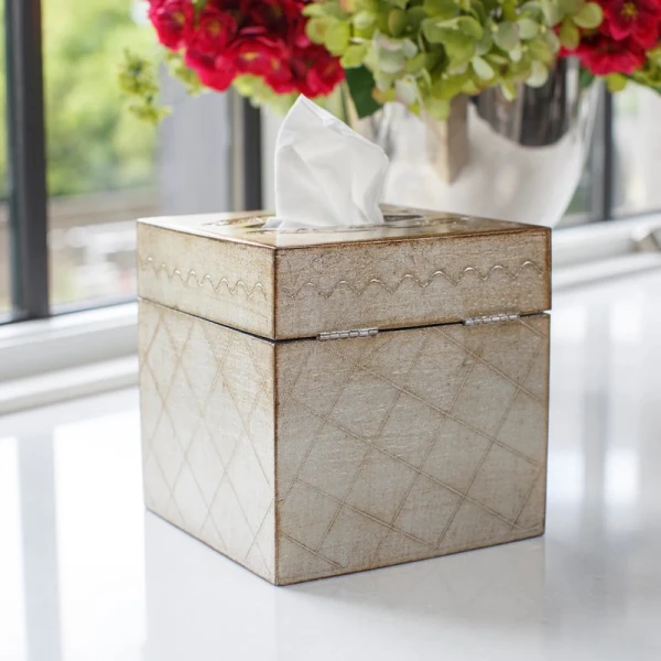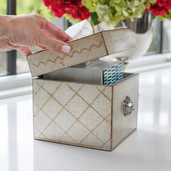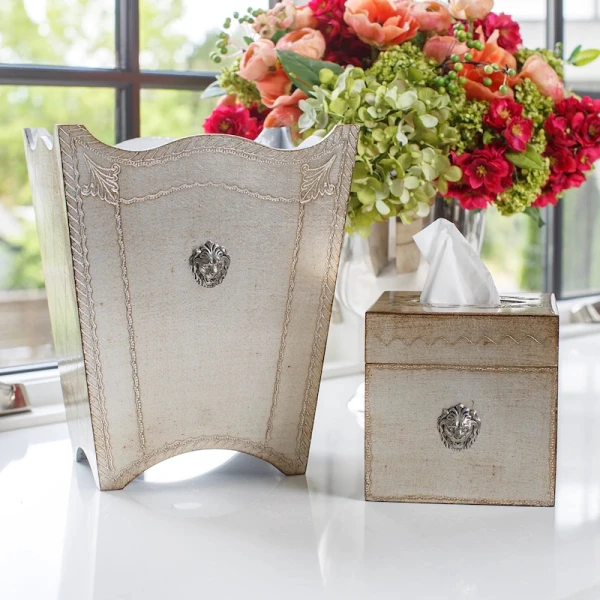 Arte Italica's Florentino Leone Wooden Tissue Box Cover adds a regal touch to your home décor! Its wooden construction, silver finish and gold leafing with an elegant pewter lion's head are an exquisite combination. Its timeless aesthetic will be an elegant addition to your home. Made in Florence Italy.