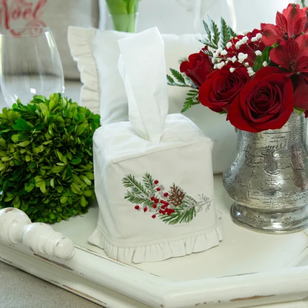 Arte Italica's Natale Sprig Velvet Tissue Box Cover is festive and practical. Enjoy this 100% European velvet embroidered tissue box cover with the Natale design. It is a perfect way to dress up a guest room or bathroom, complete that elegant seasonal look, and hide the unsightly tissue box.