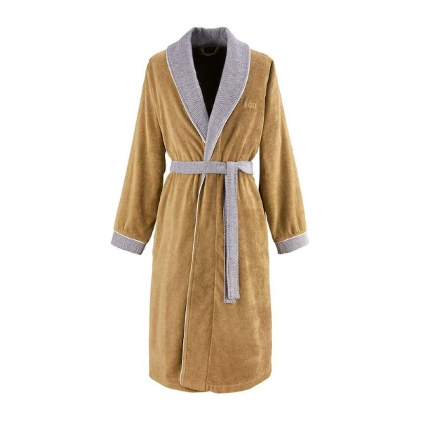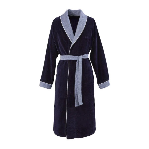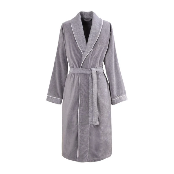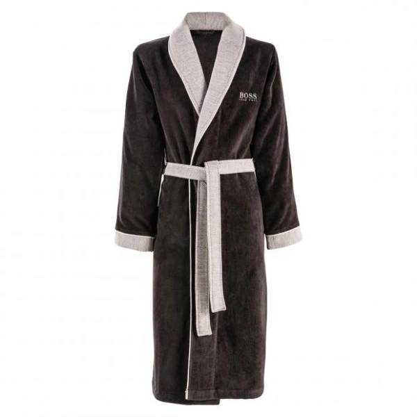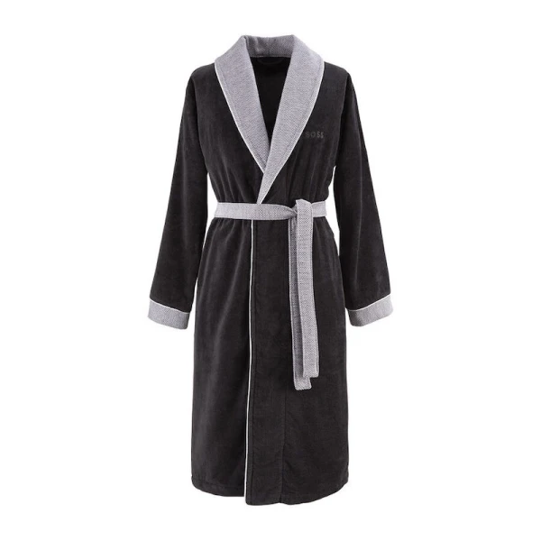 100% cotton, velour bathrobe with shawl collar, cotton textured panel, belt, cuff band wrists, 370 gsm. Available in 4 colors: Ice (White with Grey interior) & Onyx (Black with Silver interior), Navy and Camel.