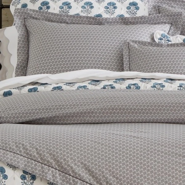 Georgia -- is classic Lulu DK for Matouk. A hand drawn medallion print on a 500 TC Egyptian cotton percale. Woven and printed in Italy.  Shown with Joplin as the coordinating pattern. Duvet covers reverse to Luca solid white. Duvet is finished with a 2" flange.