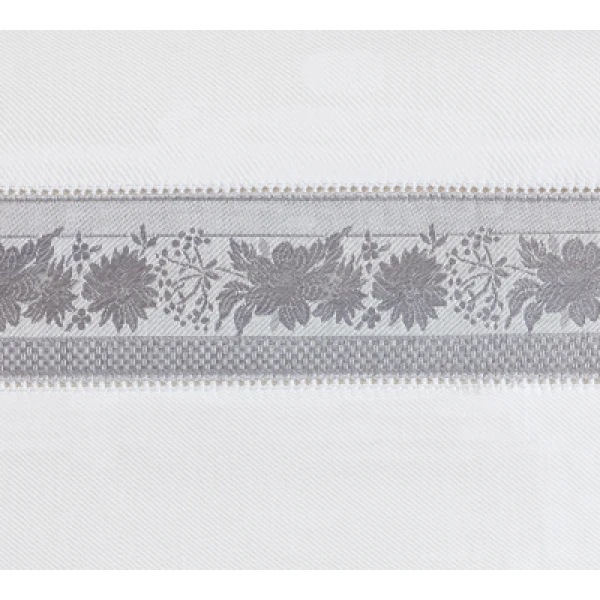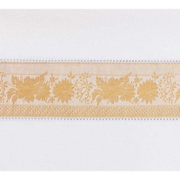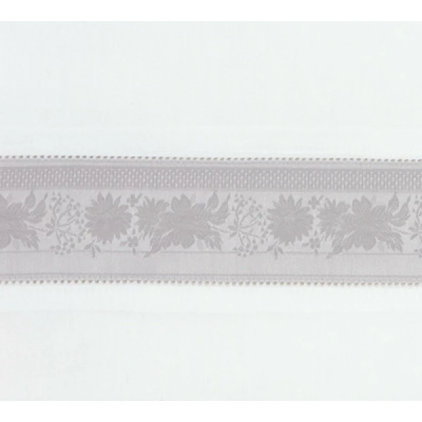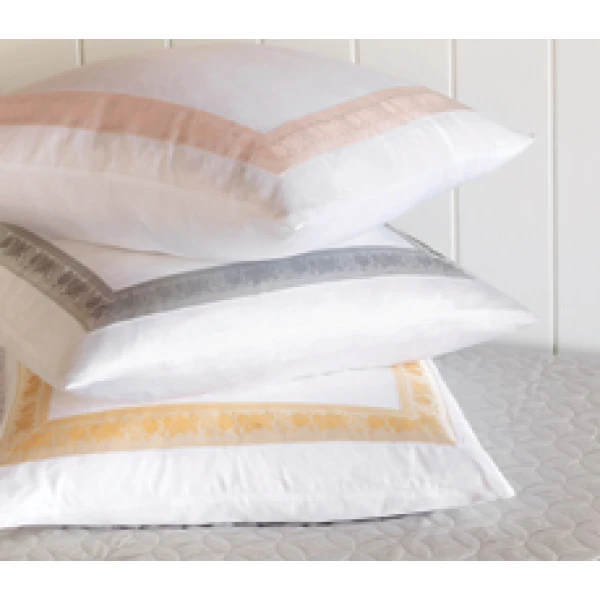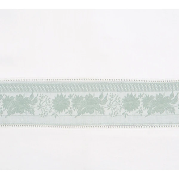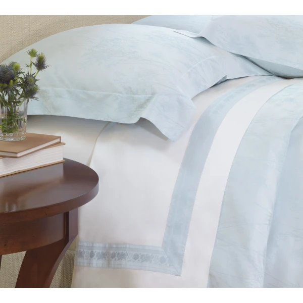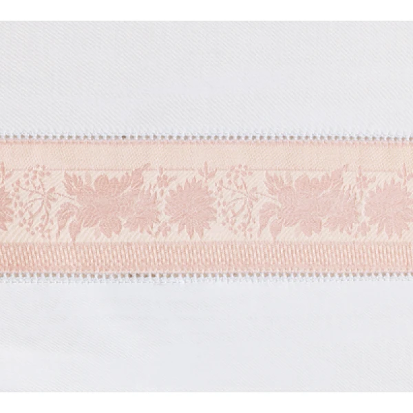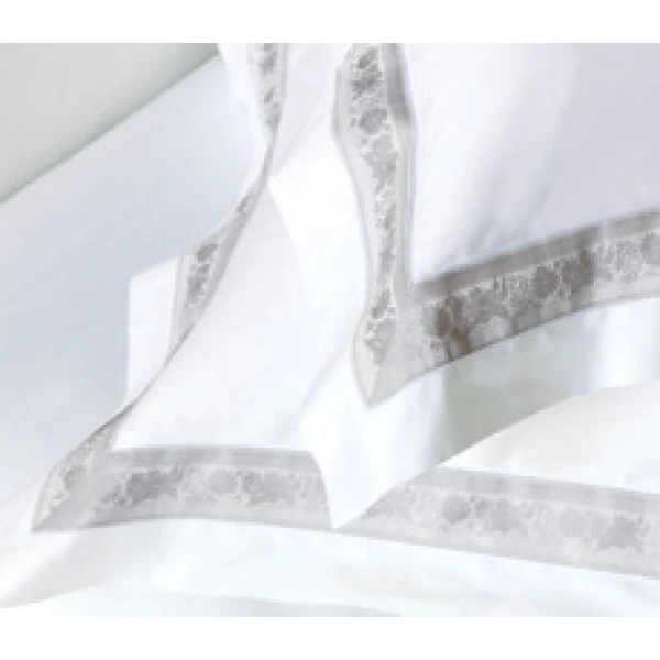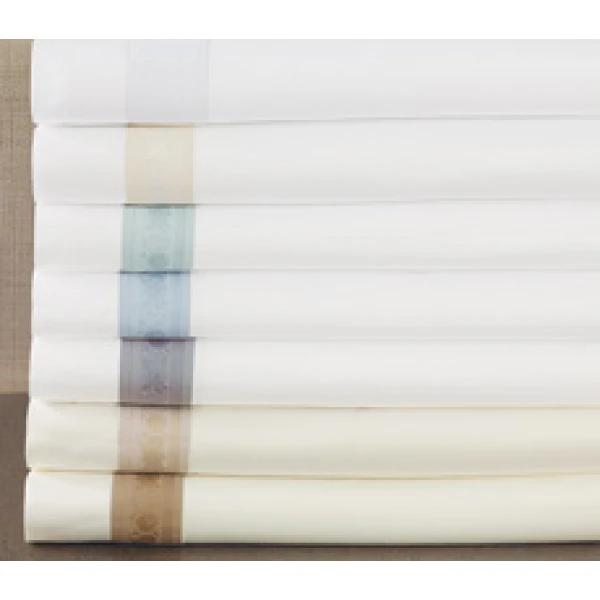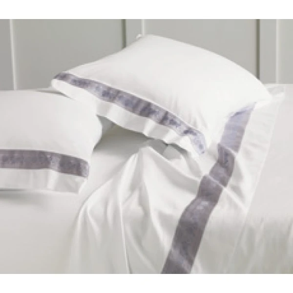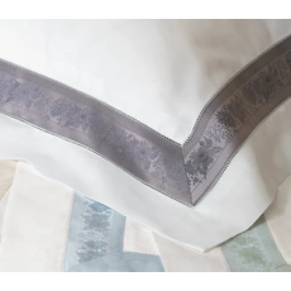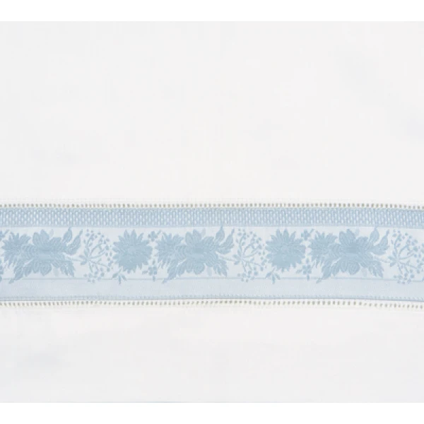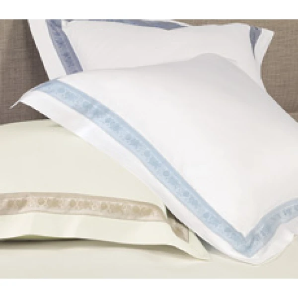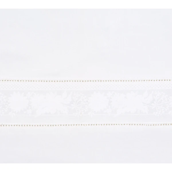 This ribbon bordered pattern is double hemstitched on a 300 thread count Egyptian cotton sateen.  The Duvet Cover has an inset of the ribbon in a U shape.  Use Vanity sheeting for the coordinating fitted sheets in white or ivory. Allow four weeks for delivery. Nancy Koltes' Best Seller!