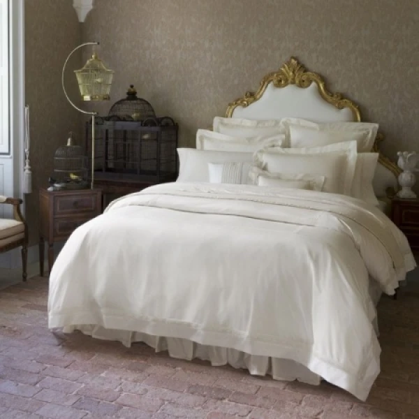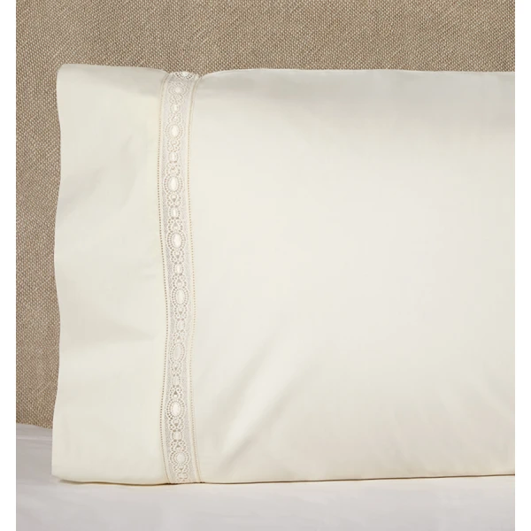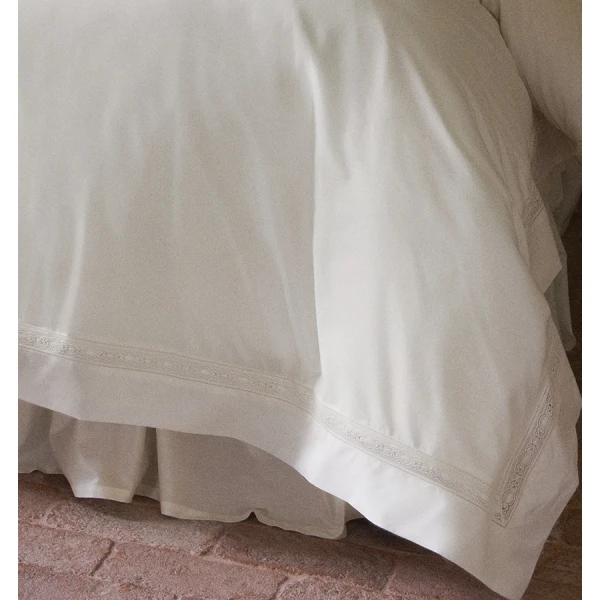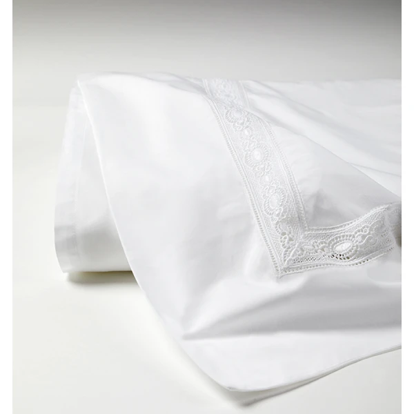 What wondrous traits might a bed linen named after a specific genus of cotton offer? Something akin to a richly detailed dream. Of all the world's cottons, (and for that matter, of all Egyptian cotton), Giza 45 is the dreamiest, able to be spun by our expert Italian craftsmen into a super-fine yarn that can thus be woven into a sleek, supple fabric. Which, it turns out, beckons as one of the finest, most inviting of places to lay one's hear, providing an enveloping cocoon of soft, comfortable perfection. Here, the Giza 45 cotton yarns are woven into a lightly crisp and smooth percale, and skillfully stitched with an Italian-made lace insert that highlights its airy fretwork patterning to best effect. Lace sits at the cuff of the sheets and cases, forms a U-shaped design atop the duvet cover and alongside the fanged edges, as well as embellishing each side of the shams. Simply stated: there's nothing else like it.