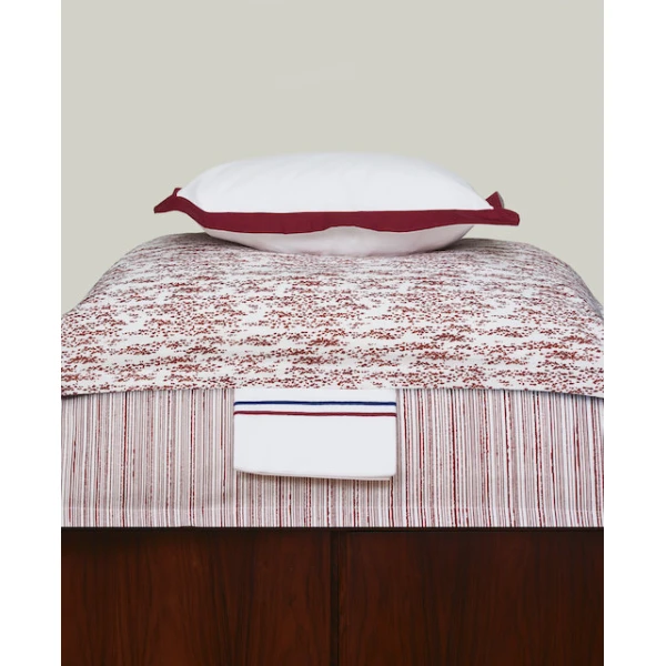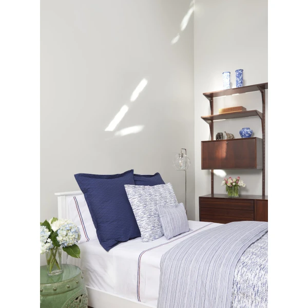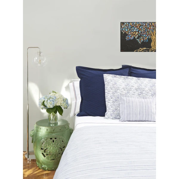 Mike is an uneven stripe which reads more like a textural pattern. Mike is available in Bordeaux, Navy, and Sea Glass. Duvet covers can be self reversing or reversing to Sara. Shams have 1†flange.