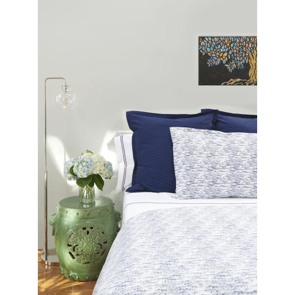 Sara is a printed pattern that looks fresh and yet contemporary. The design is created by a mix of tonal paint splatters. A unique texture. Sara is available in Bordeaux, Navy and Sea Glass. Shams are constructed with a 1” flange. Duvet covers can be self reversing or reversing to Mike.