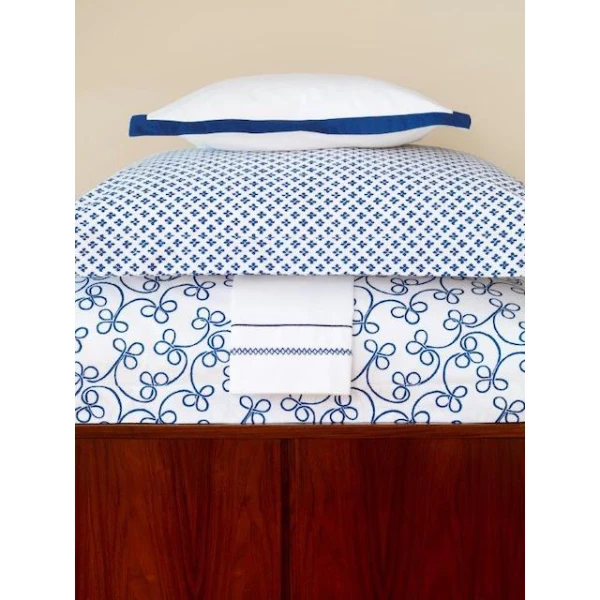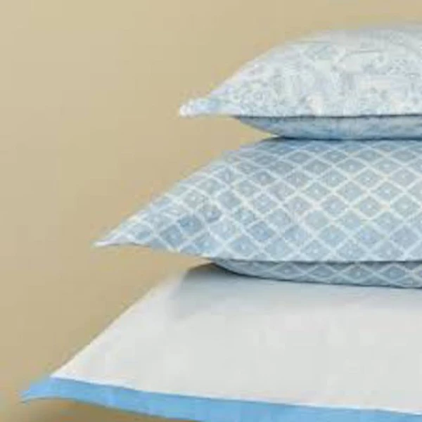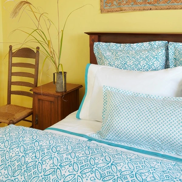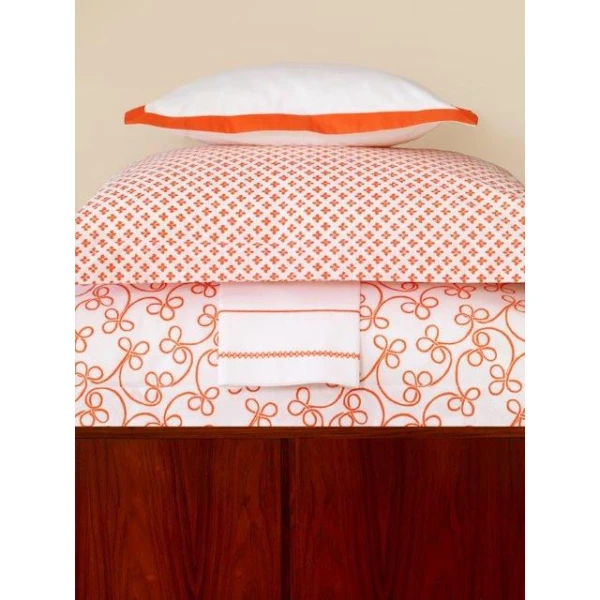 Sofie is a darling bedding.  Its a small ikat pattern resembling little diamonds.  You can mix this bedding with other collections or use alone.  It comes in several bright cheerful colors and makes for darling bedrooms. The duvet covers are self reversing and have plain hems.  The Shams have 1" flange.  Printed and finished in Italy.  Constructed in the USA.