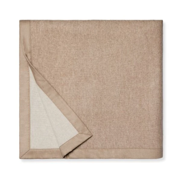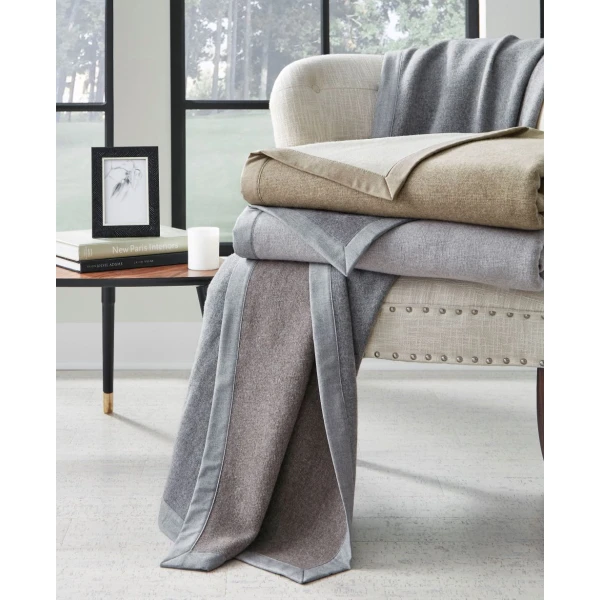 Sferra's Nerino blanket, in superfine Merino wool, is double-faced in classic, menswear hues for a well-dressed room. Grey reverses to walnut.