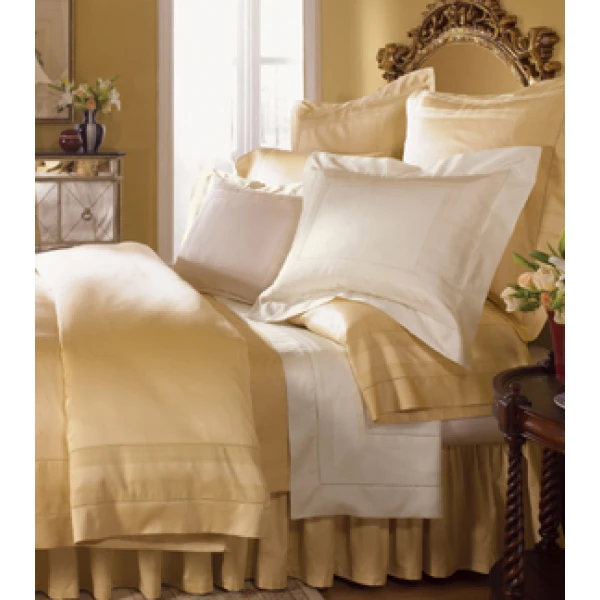 Distinctive 100% Egyptian cotton sateen sheeting woven to an unmatched 1020 TC. Intricate jacquard inset border design exhibits the expert handwork of Italian masters. Finished with a delicate and precise hemstitch on either side of the woven border.