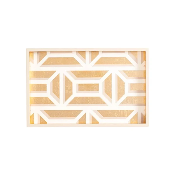 Caspari's Garden Gate Lacquer Vanity Trays are timeless accents for your home.   The design is a graphic and architectural pattern.  This striking pattern is inspired by the lines of garden trellises.  They are eye-catching accents for your home.  Perfect for putting the finishing touch on your table setting, serving guests, or creating a purely decorative display, they are highly versatile and beautiful.  Their shining finish shows the true beauty of the original artworks and ensures a durable surface.  Trays featuring metallic accents are made with genuine gold or silver leaf.  Caspari Lacquer Trays are an elegant and thoughtful gift for nearly any occasion.