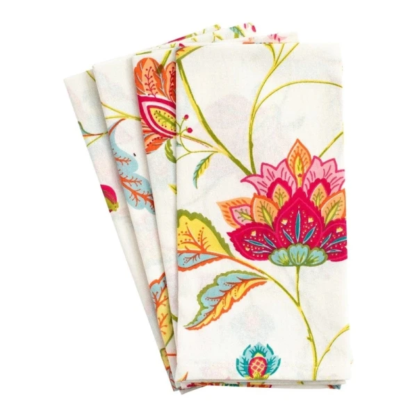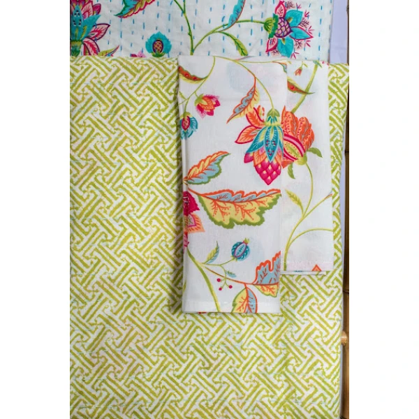 Caspari's Passage to India Cloth Dinner Napkins were inspired by the handcrafted beauty and rich colors of traditional Indian textiles.  Caspari has chosen some of their favorite patterns and printed them in a large scale for an eye-catching and contemporary look.  Designed to match the reversible cotton table covers, each set of 4 hand printed cotton napkins brings color and style to the table. Machine wash cold. Tumble dry low.  100% cotton.  Handcrafted in India.