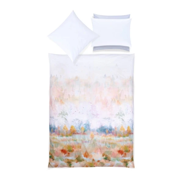 Christian Fischbacher's Aurum's design has delicate wisps of mist float over the treetops, giving the print design a light appearance that fades into brilliant white. Colorful ochres, reds and greens illuminate the trees and grasses. Painted in the in-house atelier, the autumnal atmosphere is printed in Northern Italy on the exclusive and well proven cotton sateen. Zipper Closure. 100% Cotton.