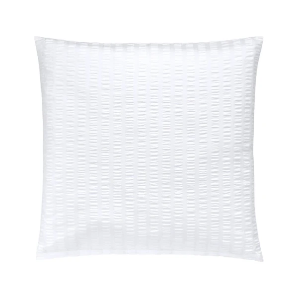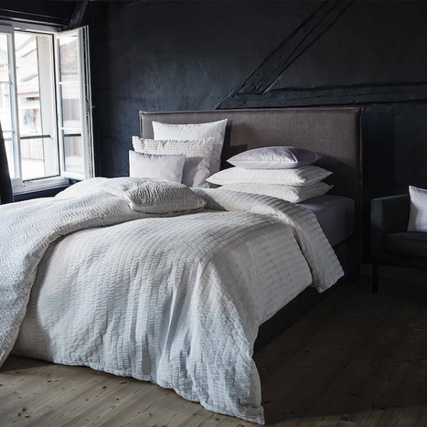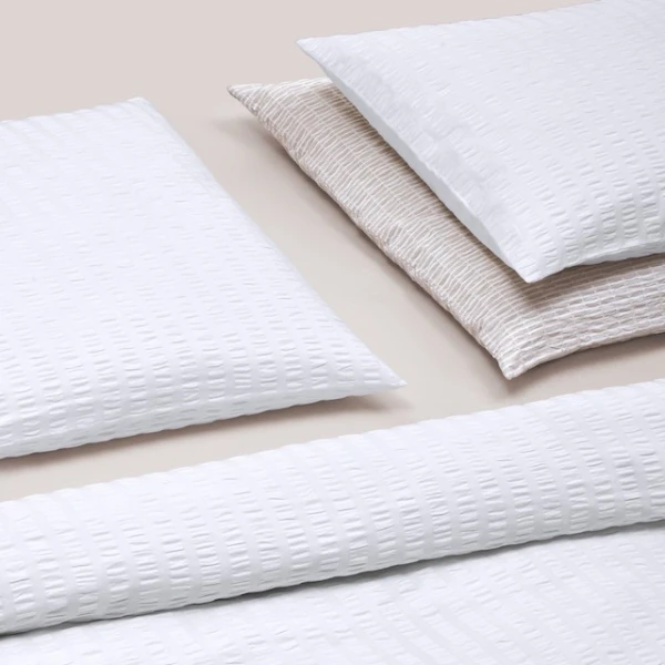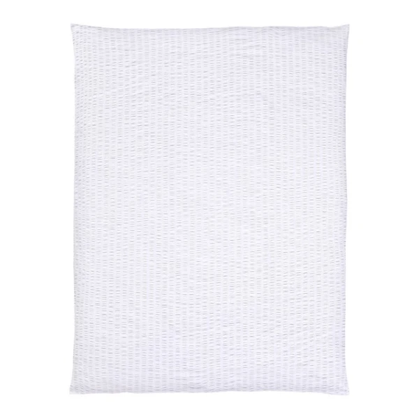 Christian Fischbacher's Flow is a generous stripe design of pure cotton. With its three-dimensional surface and easy-care properties, this popular quality meets the current spirit. The varying tension of the warp threads gives the fabric a pleasant, lively feel. The white surface is soft, non iron and easy-care and a classic in the world of bed linen. 100% Cotton.