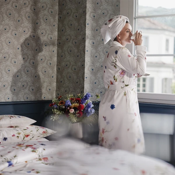 Christian Fischbacher's Fleurs Volantes Bathrobe has dahlias, zinnias, delicate cosmeae, and deep blue cornflowers that shine on bright white fabric. Inspired by the playfully light room installations by Swiss artists Steiner/ Lenzlinger, this cheerful floral arrangements make us long for summer. The extra-long staple cotton forms the basis for the photographed and hand painted flowers and tendrils. Elegant turn-down collar and side pockets for practical comfort. 100% cotton.
