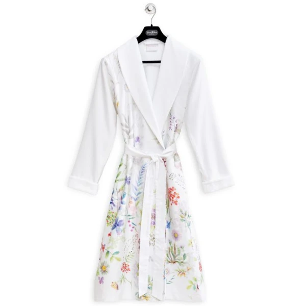 Christian Fischbacher's Giardina Bathrobe will immerse you in a magical world of flowers and sweet surprises. Dream of pictures in delicate colors surrounded by refreshing white. Become part of enchanted places, discover bountiful lands and create wonderful worlds of your own. Experience tangible new dimensions. Give your imagination free rein with Mellow Meadow and get in touch with your sensuous side.