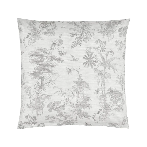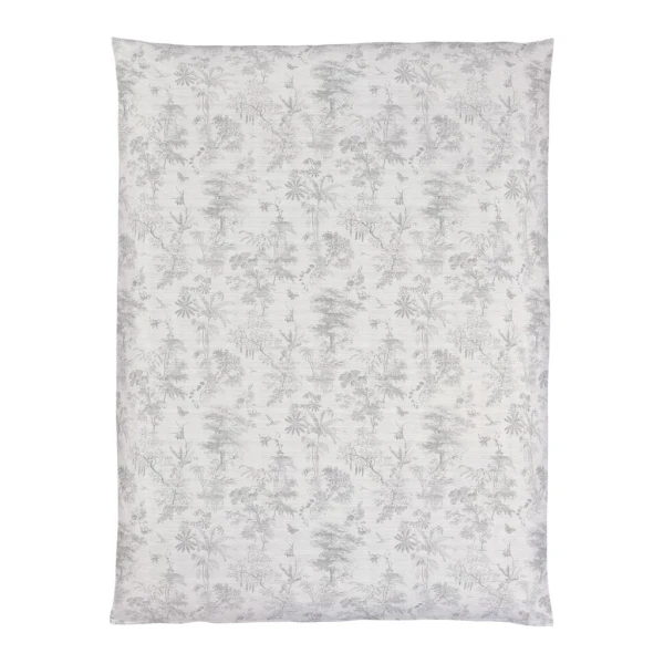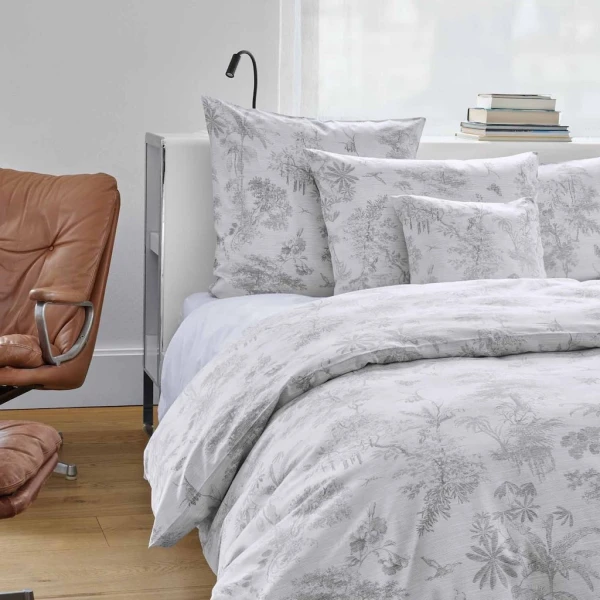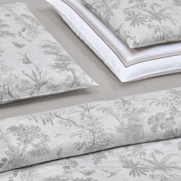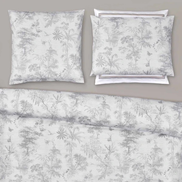 Christian Fischbacher's Illusion's design at first glance looks like a jacquard, but in actual fact, the designs have been printed directly on the sateen. The fine horizontal lines create a subtle moiré effect. They were drawn by hand and the crafted interplay of line thicknesses accentuates the delicate motifs and conjures up a detailed landscape. 100% cotton sateen.