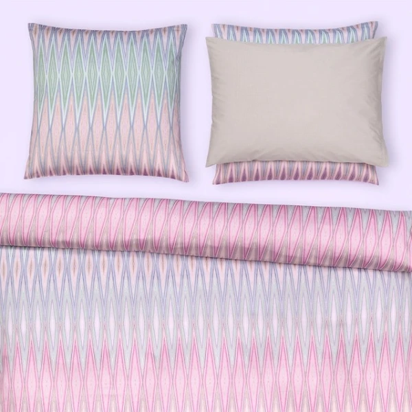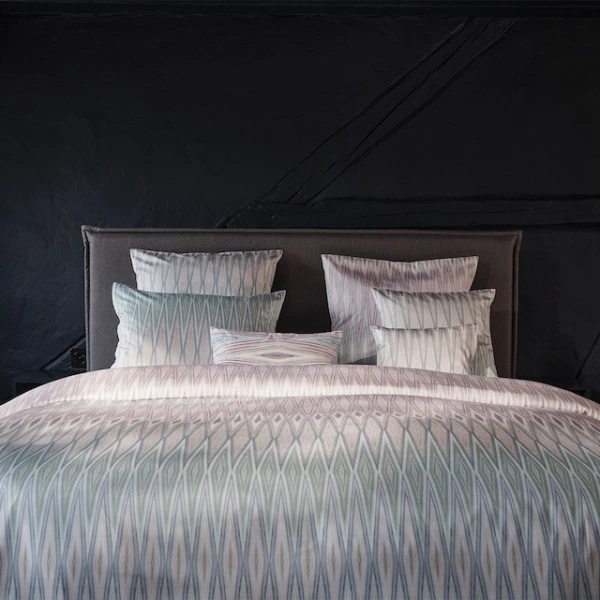 Christian Fischbacher's Rhythm has a technique that creates a typical, slightly blurred look in the motifs thanks to the partial coloring of the yarn. Natural materials such as onion skins, pomegranates and walnuts were traditionally used for coloring. In a modern interpretation, the pattern based on this technique surprises with fine lines that reveal a variety of colors on closer inspection. Generous rhombuses imitate the elaborate art of Ikat weaving. 100% Cotton.