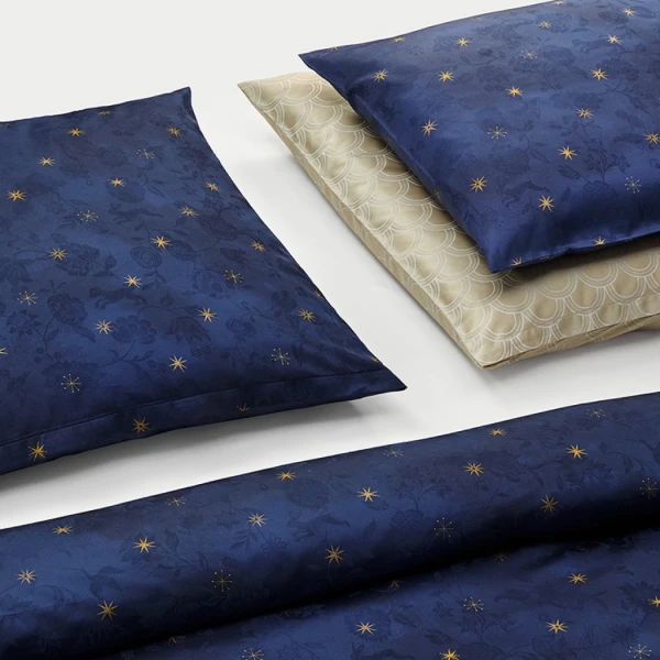 Christian Fischbacher's Shooting Star was inspired by golden ceiling paintings. This night sky shines in the deep hours of the night. Printed on a precious jacquard fabric, the dream forest appears subtly in the woven ground and only becomes visible through the shiny and matt weaves of the fabric. As a novelty, the combination of jacquard and print is the SHOOTING STAR of the collection. Experience luxury and creativity in symbiosis. Welcome to a world of timeless elegance and textile sophistication. 100% cotton.