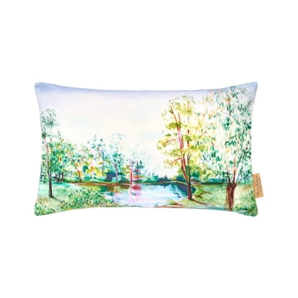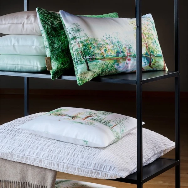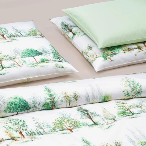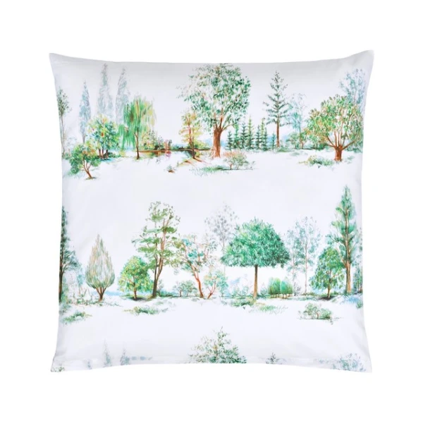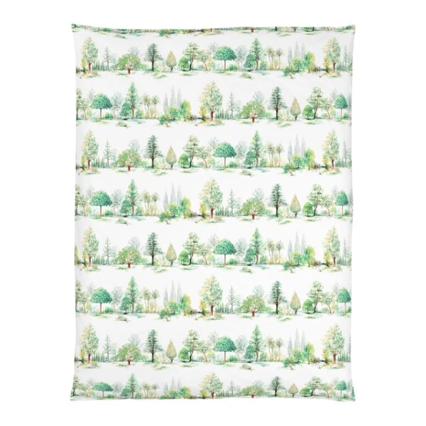 Christian Fischbacher's Trees uses a modern printing technology. The detailed hatchings are printed in a rich green palette on our white cotton satin. Trees is a tribute to the beauty and vitality of trees. The motifs were drawn by hand in our studio with colored pencils and arranged in elegant rows. 100% Cotton.