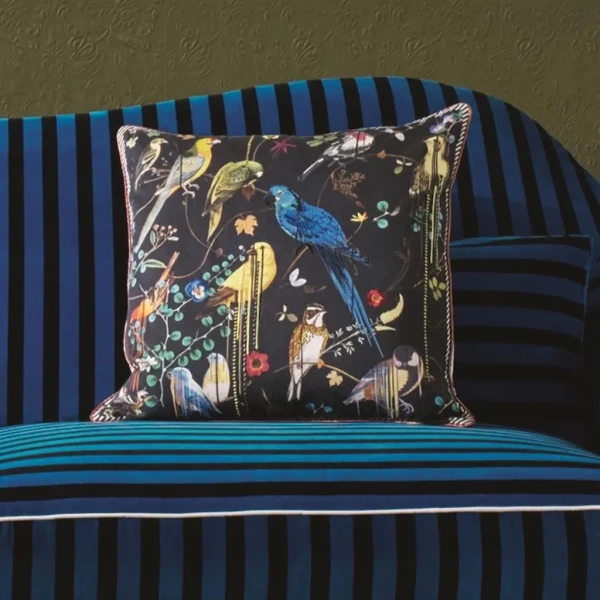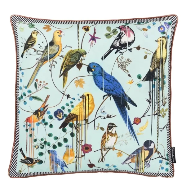 Designed by Christian Lacroix and imported by Designers Guild. Birds Sinfonia Crepuscule has a wonderfully exotic array of birds that adorn this vibrant cushion from Maison Christian Lacroix. Colors merge into one another in graphic lines. This stylish decorative pillow is digitally printed onto cotton with delicate embroidered highlights. 100% cotton.