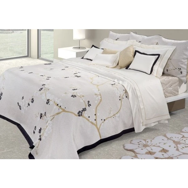 A unique and luxurious coverlet, Cerisier is designed and made by Celso de Lemos of a blend of 75% giza extra long staple cotton and 25% viscose. Bordered in a black sateen, the flowers and branches are in calming neutrals. Available in a queen and king coverlet and zipper closed euro shams.