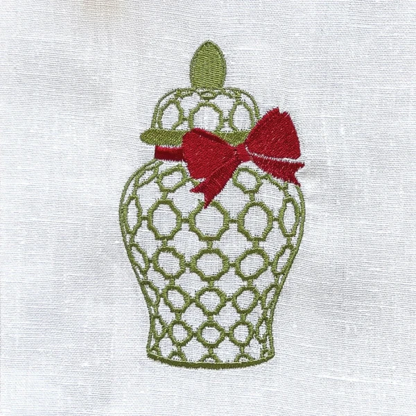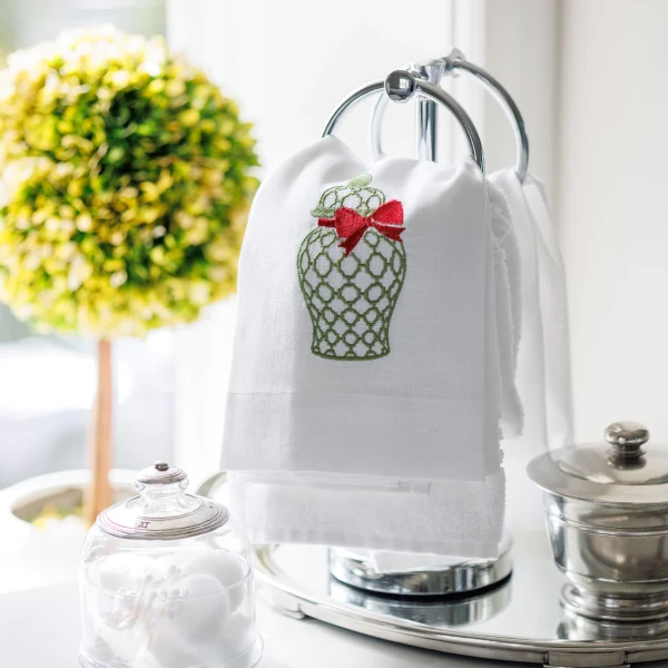 Arte Italica's Towels are beautiful. Dress up that kitchen or bath with this beautiful 100% European linen embroidered towel. So many ways to add beauty to any part of your home. A classic ginger jar embroidery in holiday colors.