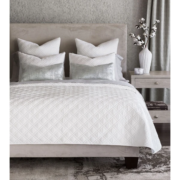 De' Medici's Coperta has a classic lattice design that stretches elegantly across a lightweight silky sateen. Style its washable quilted pieces solo or mix and match with your favorite bedding. From crisp white to soothing sea, Coperta is a sophisticated addition to any home. Coverlet has round bottom corners and solid edge welt. Shams have a knife edge finish and a hidden zipper closure for easy care. 300 thread count quilted sateen coverlet crafted from 100% Egyptian cotton. Woven in Italy.