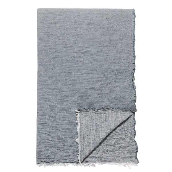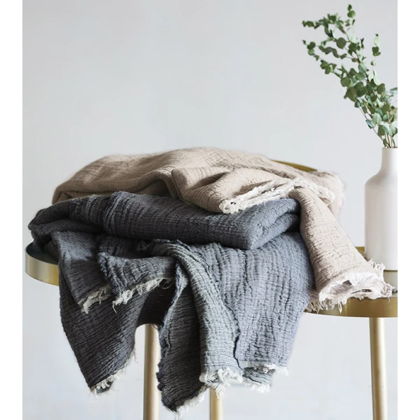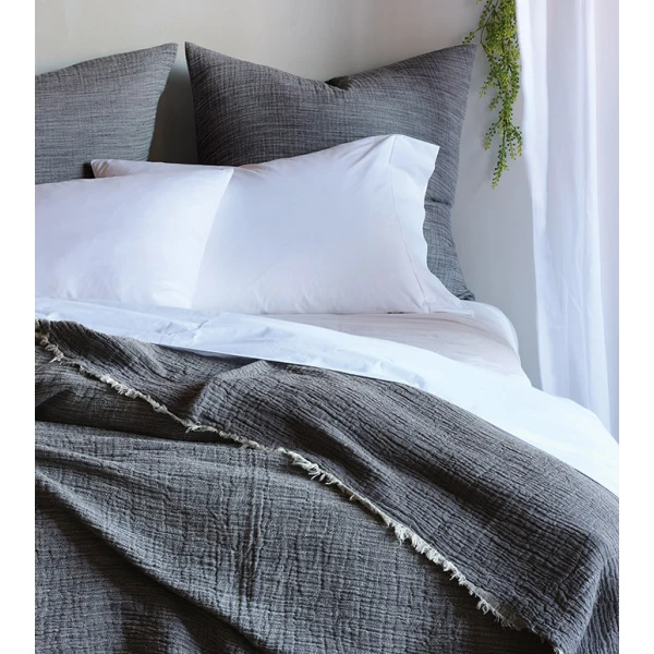 Delaveen, from de Medici, is a 100% cotton woven in Italy that has been pre washed to give it a subtle and soft texture.  Layer on many of the de medici beds to add a contrast. Note the throw has frayed edges.