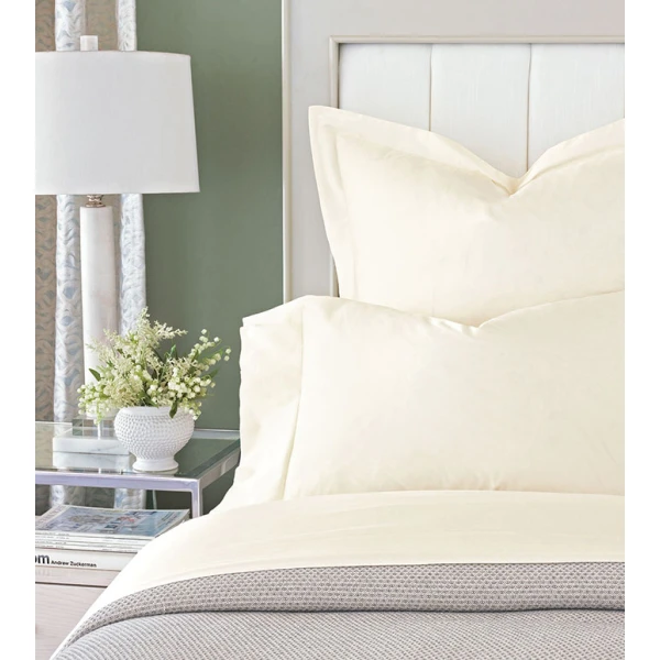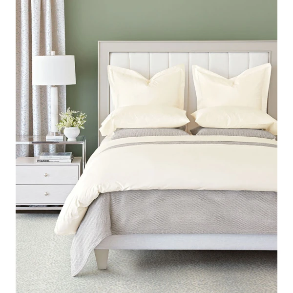 de' Medici's Fresco is a slightly more modern-looking cousin to our popular Roma Classic and Luxe collections. We've done away with the hemstitching details and removed the flange from the duvet cover to create cleaner lines.  2" self flange with top stitch on the shams and  Flap closure for easy care.  Duvet cover has a knife edge finish, ties inside, and a hidden button closure. 300 thread count sateen. Woven in Italy of the finest Egyptian cotton.