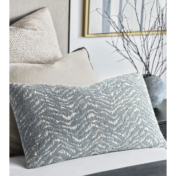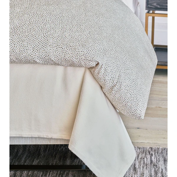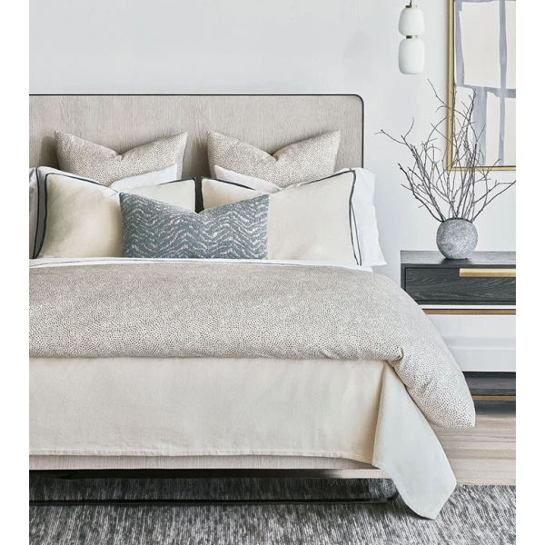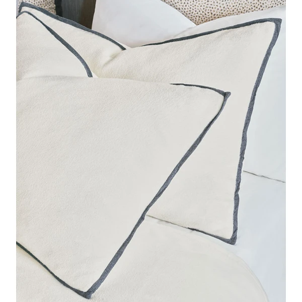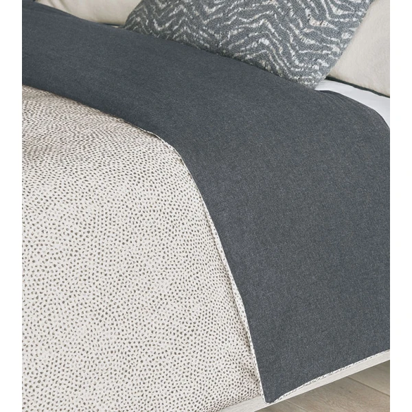It has ties inside all four corners for easy comforter attachment and an invisible zipper closure for easy care. Euro sham reverses to Bruno Dark Gray and an invisible zipper closure. Shams reverse to self, have welt edge in Bruno Dark Gray, and have an invisible zipper closure. Blanket is self backed with 1" hem with mitered corners.