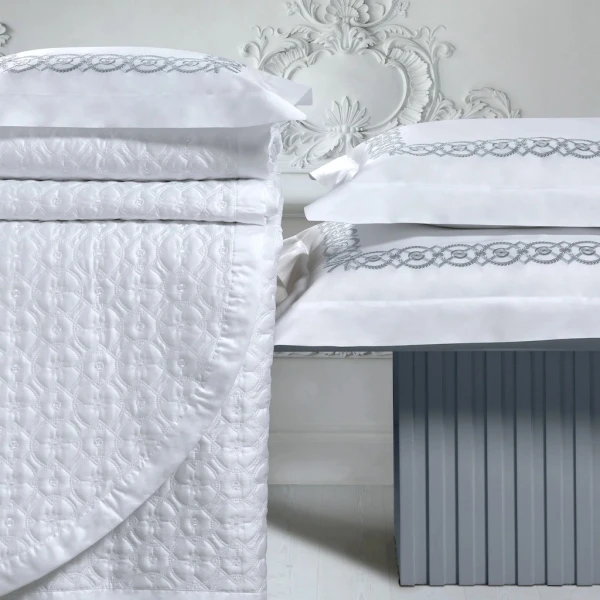 DEA Diamond Wreath Quilted Coverlet is made of smooth cotton Raso sateen and refined stitching. This stitching lends to a beautiful three dimensional rosette effect. Made in Italy.
