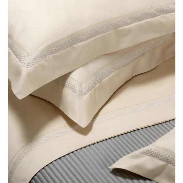 Dea Liri Lace  features sophisticated, modern lace inlays with all sides of the lace sewn to the fabric. The lace is transparent because the fabric underneath the lace after sewing is cut by hand. In addition, the Liri collection features openwork embroidery that frames the lace adding grace and elegance. The entire process imparts a modern linear style. The Liri Collection uses an extremely soft and pliable cotton lace with an exclusive Dea design. The tone-on-tone laces appliques are available in four colors.  Made in Italy.