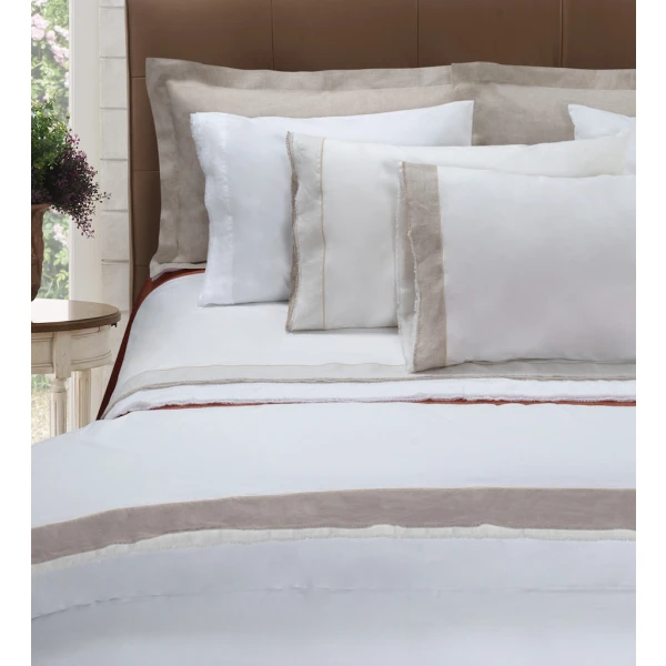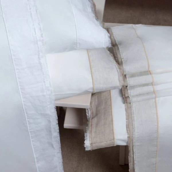 Duvet Cover: Hand-made fringed double flanges applied horizontal on top of the bed with a tailored single row of satin stitch.