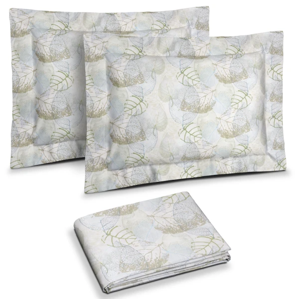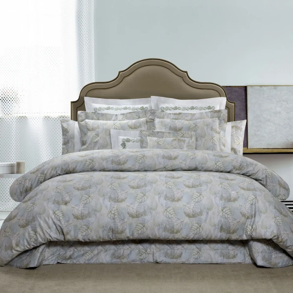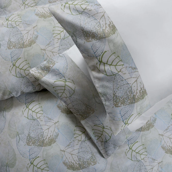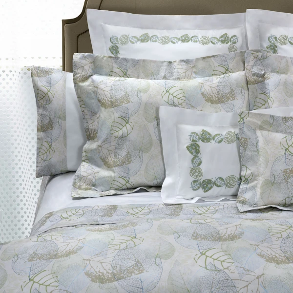 Timothy Corrigan for Dea's Feuillage Print on Raso Sateen is a graceful collection on marvelous cotton sateen fabric. It represents the historical essence of truly skilled Tuscan craftsmanship. This is a skill that is handed down from generation to generation. Feuillage is an intricate pattern of leaves. Flat sheets and pillowcases have solid Raso sateen and a printed cuff.  Duvet covers, shams and quilts are an all over print. The printing is on very high-quality cotton sateen that takes on a beautiful sine and three-dimensional quality.  Due to the wise work of tremendous artisans this printing process has a low impact on the environment.